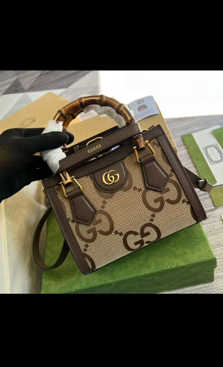 Camel and Ebony Jumbo GG Canvas Brown fur trim Antique Gold Glitter Appliques This item includes 2 decorative shapers for the handle, as shown in the image Lining: linen and cotton double g This item holds a mobile phone up to 76mm wide x 167mm high x 9mm deep 8cm long bamboo handles Adjustable and removable shoulder strap 51 cm long Mini size: 20 cm wide x 16 cm high x 10 cm deep