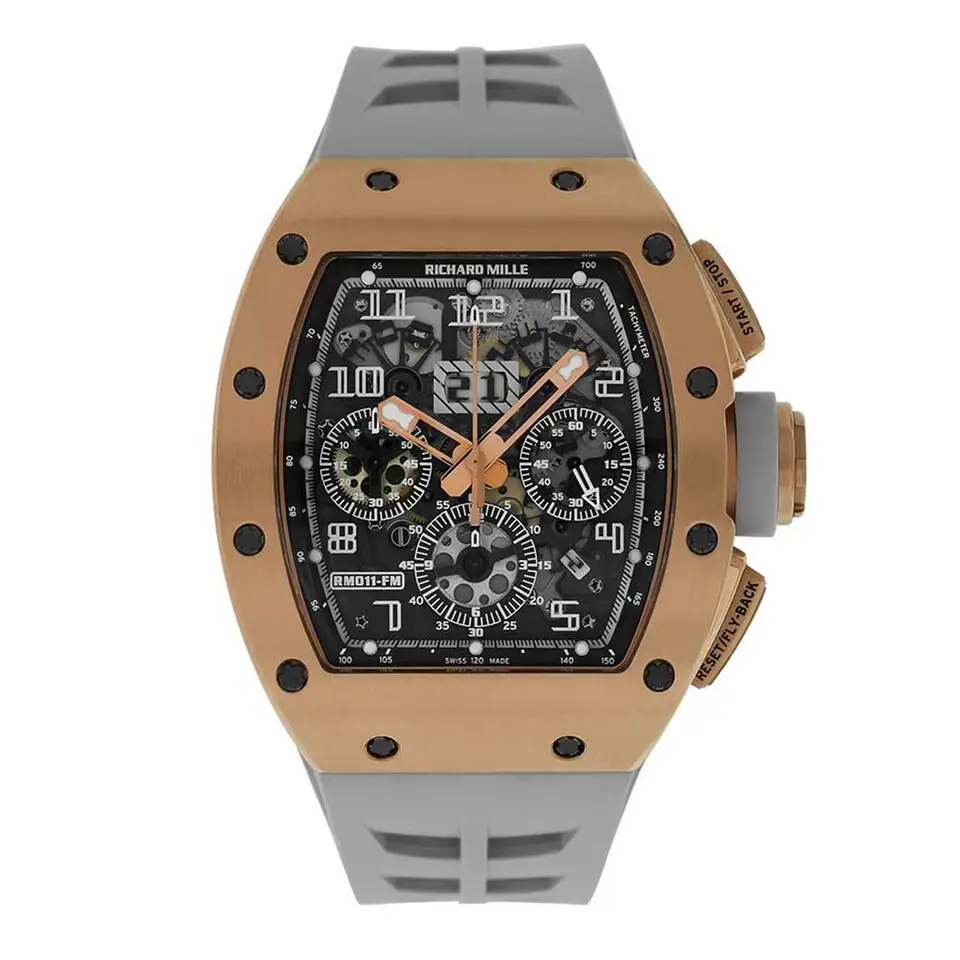 Richard Mille RM011 Replica – Rose Gold Flyback Chronograph (Grey) – Super Master Quality. A high-end replica with a rose gold case, grey skeleton dial, flyback chronograph, and automatic movement. Luxury redefined.